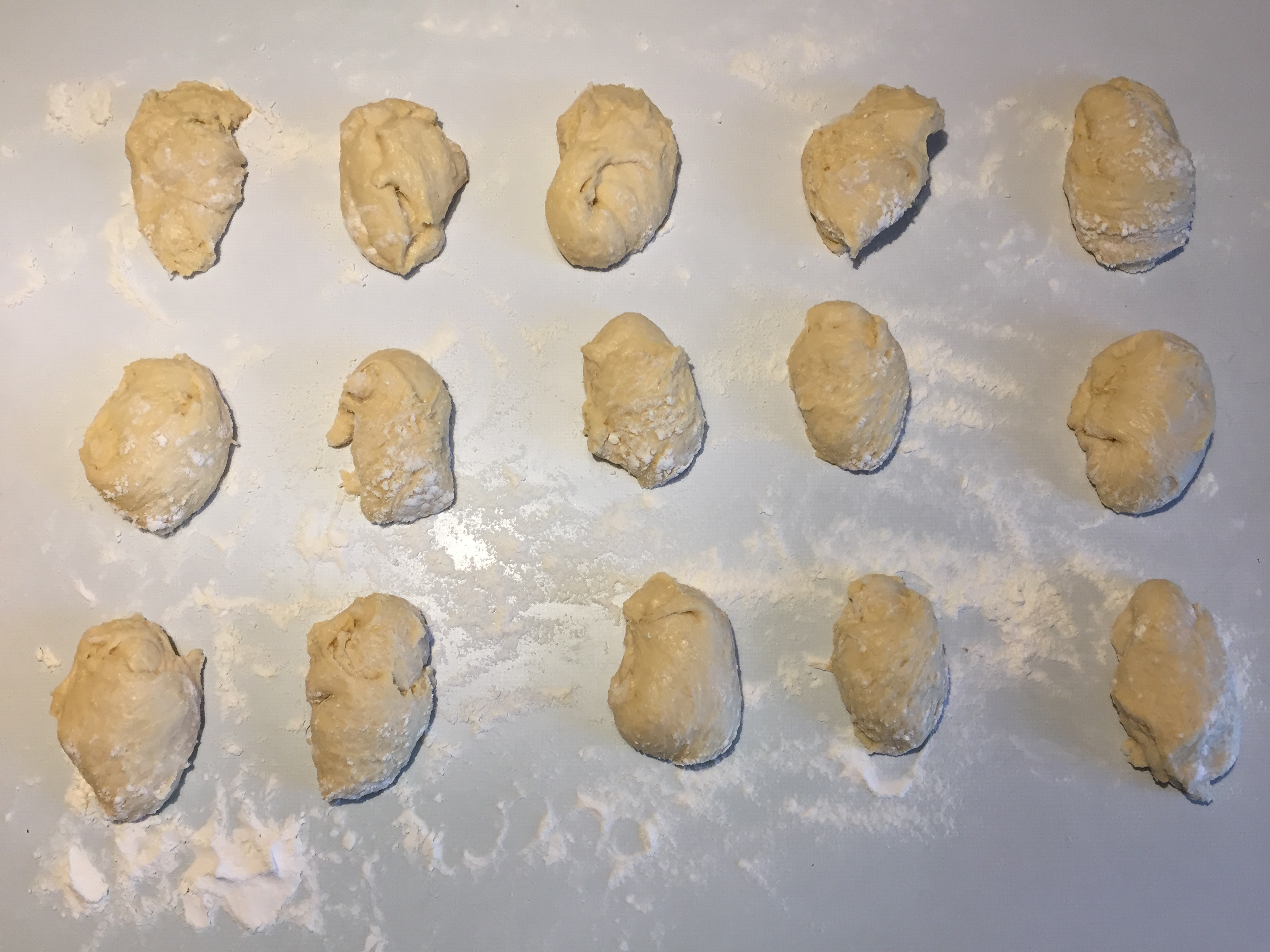- Jetzt wird die Arbeitsfläche mit Mehl eingestaubt und wir formen aus dem Teig mit einem Esslöffel kleine Nocken. Dazu den Esslöffel in das Mehl tunken, dann in den Teig und zum Schüsselrand hin den Teig abtrennen. So entstehen kleine Nocken. Diese auf die Arbeitsfläche legen. (Nocken sollten etwa fingerlang sein und eine halbe fingerlänge breit.