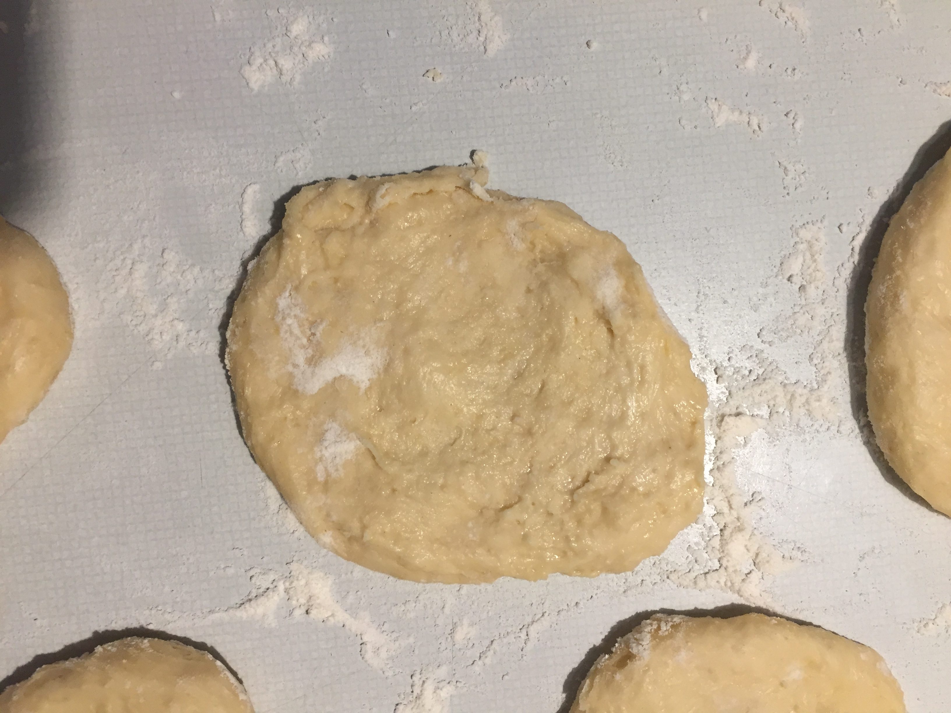 - Ist der ganze Teig vernockt, werden die Nocken nun mit den Fingern zur runden Fläche auseinandergezogen.