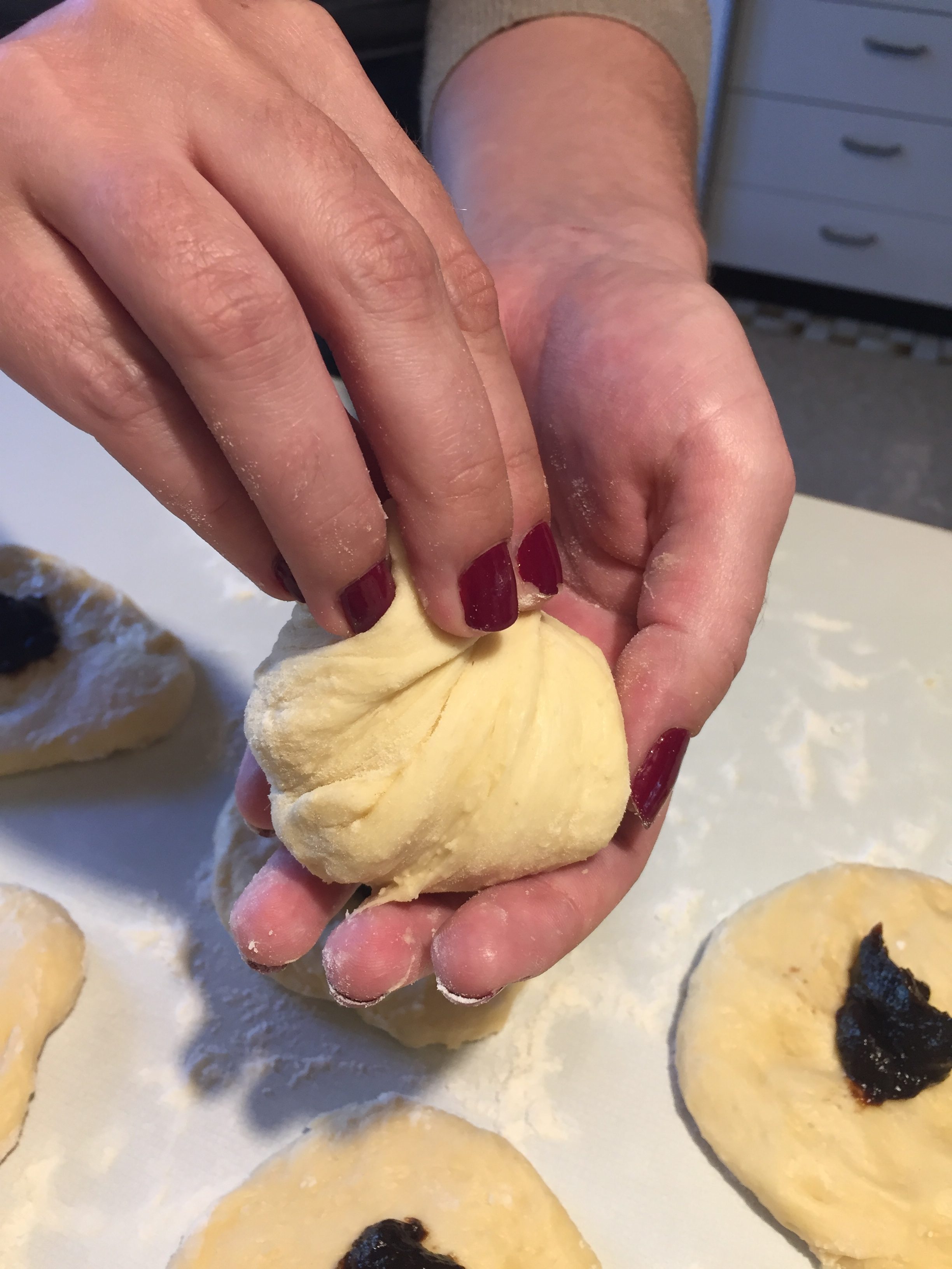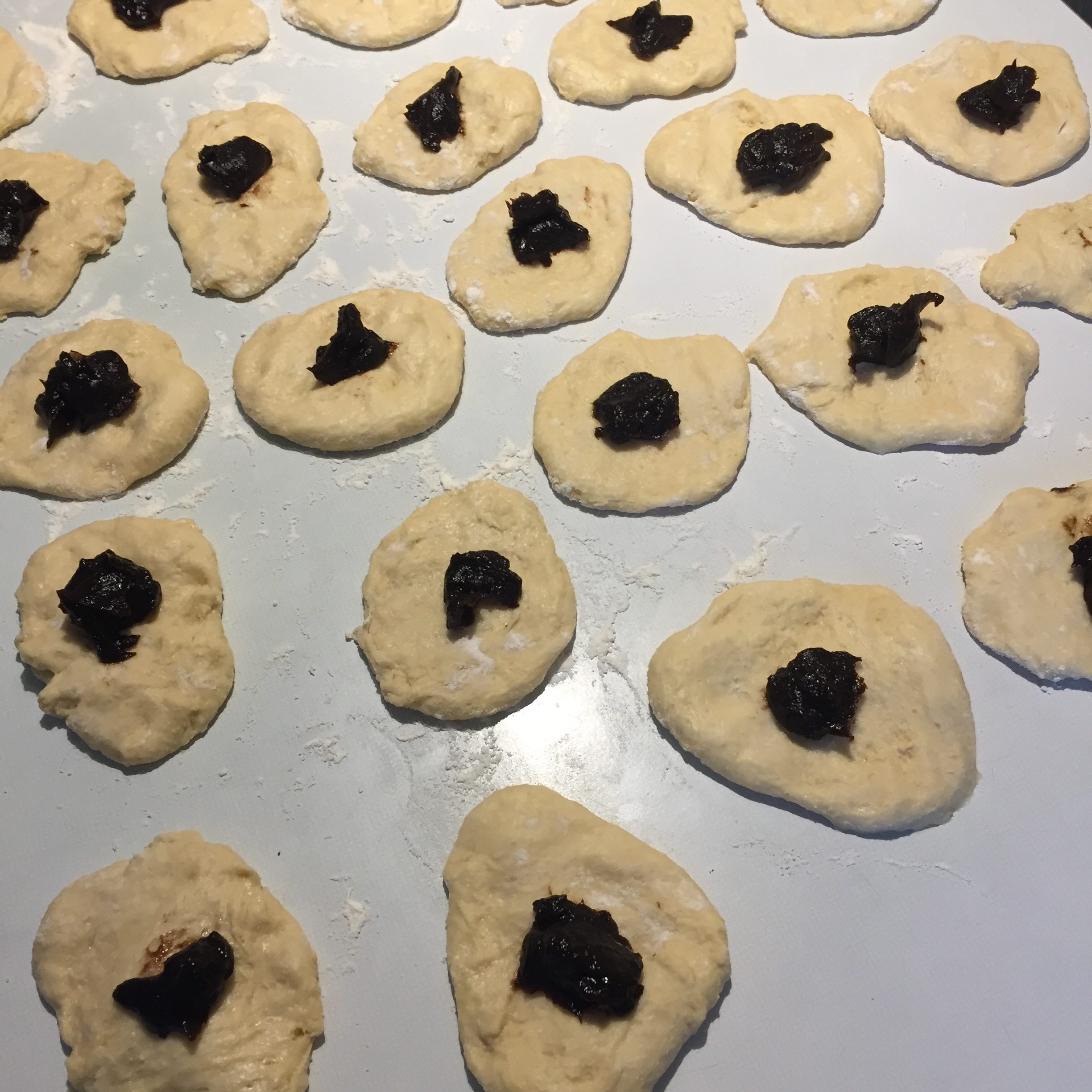 - Jetzt wird in die Mitte jeder runden Fläche ein Teelöffel voll Pflaumenmus in die Mitte gelegt. Alternativ könnt ihr übrigens auch eine entkernte Pflaume mit einem Würfel Zucker in die Mitte geben.