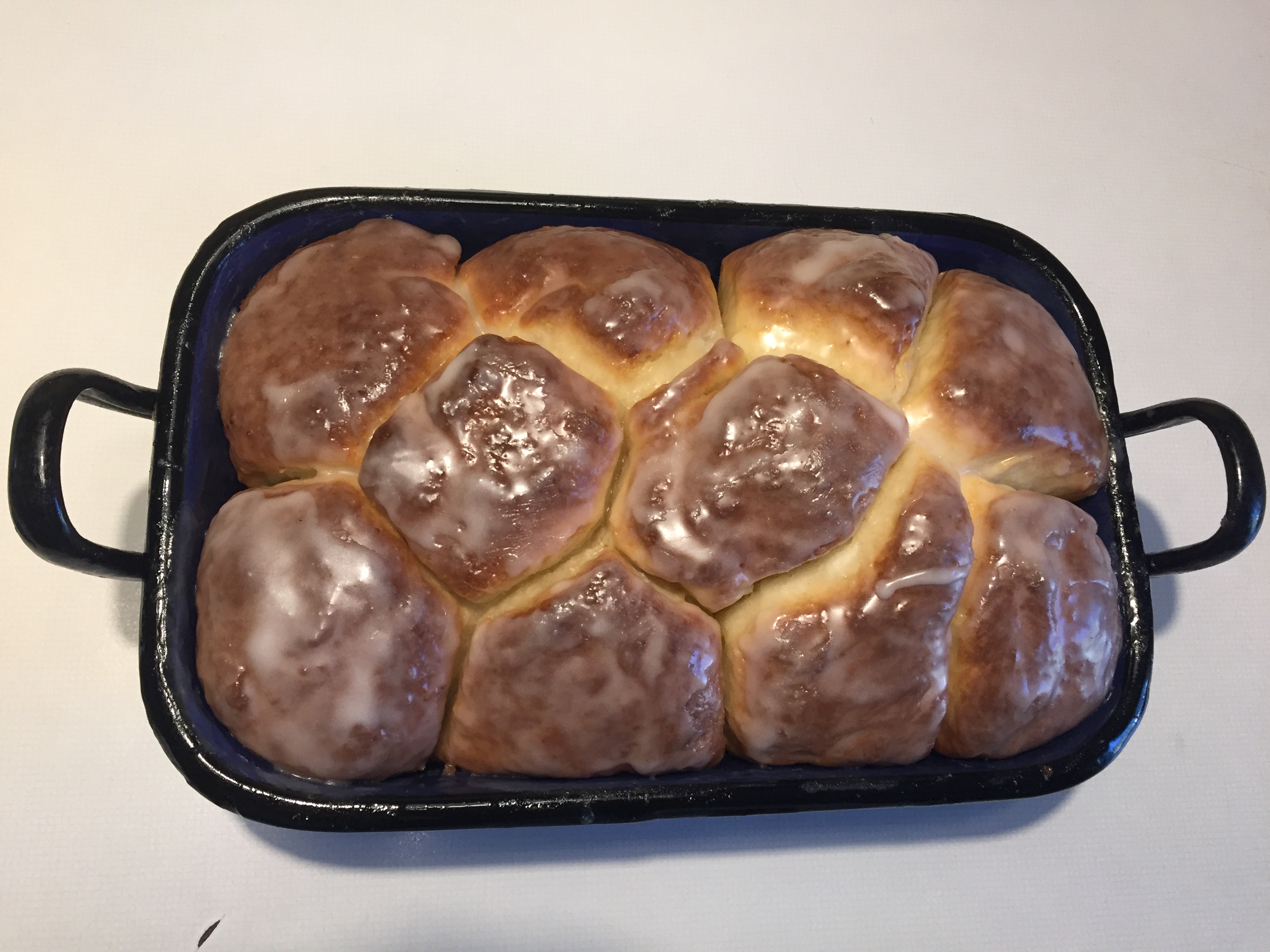 - Die Rohrnudeln nach der Backzeit aus dem Ofen nehmen und sofort mit dem Guss bestreichen.